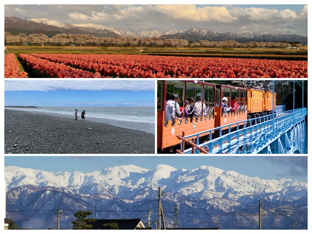周辺のエリアでは、四季折々に豊かな自然を楽しむことができます。春には、お隣、朝日町の「あさひ舟川『春の四重奏』」や地元、入善町の「にゅうぜんフラワーロード」といった花イベントが大々的に催され、農家の人たちが手塩にかけて育てた花々と自然が織りなす雄大な景色に見惚れます。夏には、県境辺りの「ヒスイ海岸」にて翡翠探しに興じるもよし。また、弊店近くにある国の天然記念物「杉沢の沢スギ」での森林浴に癒やしを求めるもよし。秋は、宇奈月温泉がおすすめです。紅葉を眺めながらの露天風呂も最高ですが、トロッコ電車に乗りながらの峡谷の紅葉狩りは、きっと一生の思い出として心に刻み込まれることでしょう。冬は、雪と悪戦苦闘の日々が続きますが、晴れ間に見える後立山連峰の雪景色は圧巻です。