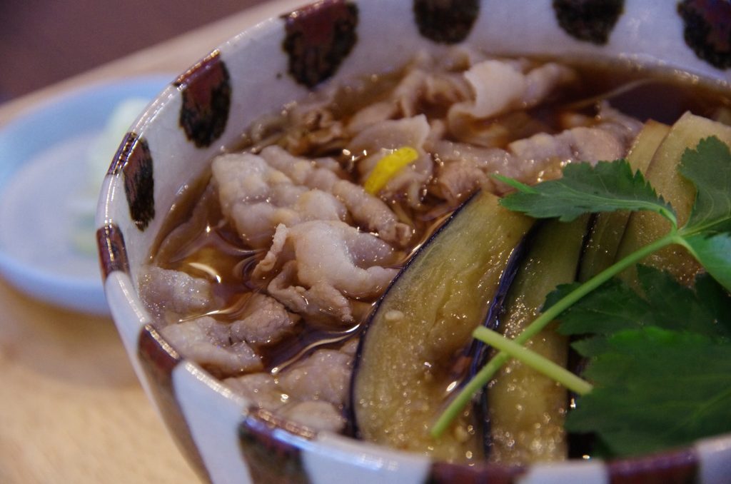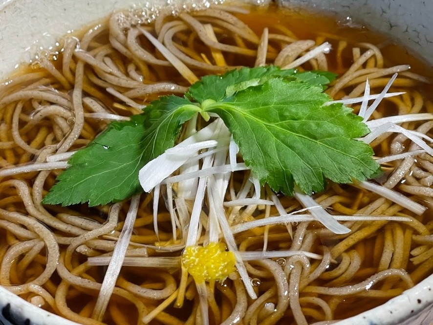 殻を取り除いた蕎麦の実を石臼にかけ、粗めに挽いた粉を手打ちした細打ちの十割蕎麦。上品な蕎麦の香りをまとい、歯応えや喉越しが良く、噛み締めると蕎麦のほのかな甘みが感じられる。味、香り、食感のバランスに優れた、万人に好まれる蕎麦。