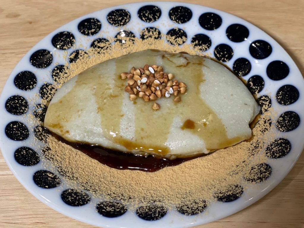 殻付きの蕎麦の実を石臼にかけ、程よい粗さに挽いた粉を手打ちした細打ちの十割蕎麦。跳ね返る食感とともに、穀物らしい風味と香ばしさが広がる。麺線には、夜空の銀河を想起させる無数のホシが散りばめられた、どこか昔懐かしい蕎麦。