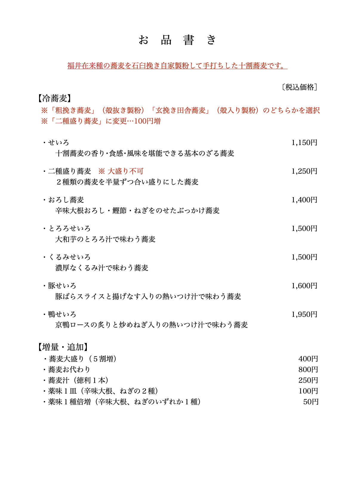 殻を取り除いた蕎麦の実を石臼にかけ、粗めに挽いた粉を手打ちした細打ちの十割蕎麦。上品な蕎麦の香りをまとい、歯応えや喉越しが良く、噛み締めると蕎麦のほのかな甘みが感じられる。味、香り、食感のバランスに優れた、万人に好まれる蕎麦。